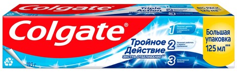Зубная паста Colgate "Тройное действие" обеспечивает комплексный уход за полостью рта. Формула с фтором защищает от кариеса, осветляет эмаль и освежает дыхание.